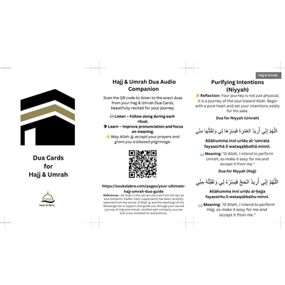 Unlike other dua card sets, our beautifully designed cards feature a QR code that instantly links you to authentic Arabic audio recitations— perfect for reverts, first-time pilgrims, and anyone who wants to listen and follow along confidently.