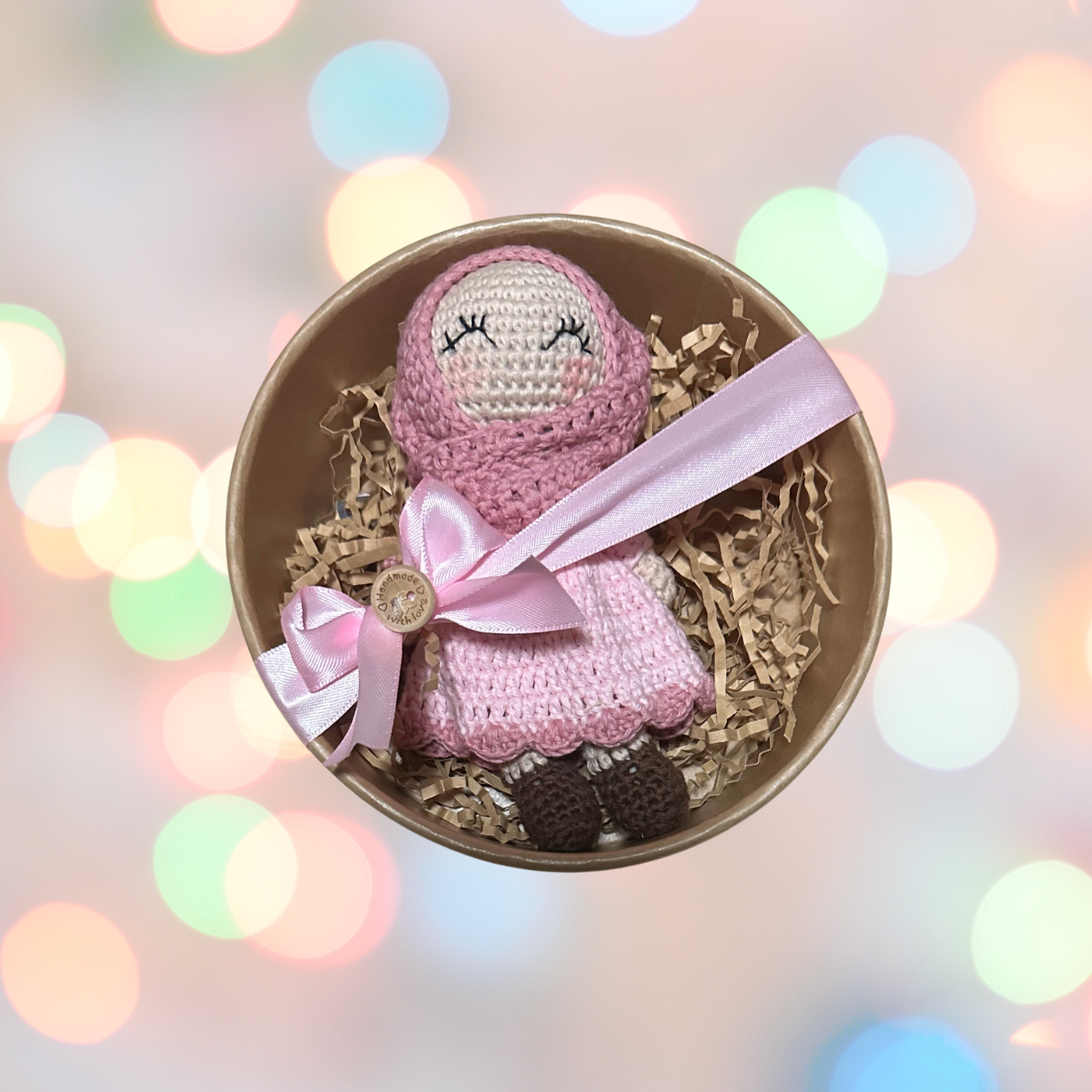 Handmade Crochet Doll Baby Set, with swaddle, bib, and brush. Perfect baby shower or newborns gift